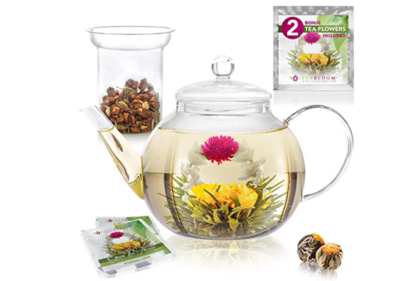 This glass pot has impressed my guests at every gathering! This set includes not only a great teapot that can be used to brew regular tea, but also has two blooming tea balls that open up and blossom into a gorgeous flower as the tea brews.