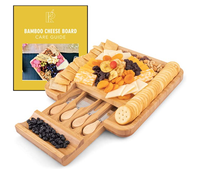Anyone will be happy to receive a great quality charcuterie set! This bamboo cheese board will add a classy touch to any celebration. It includes knife set with storage compartment to keep it neatly stored.