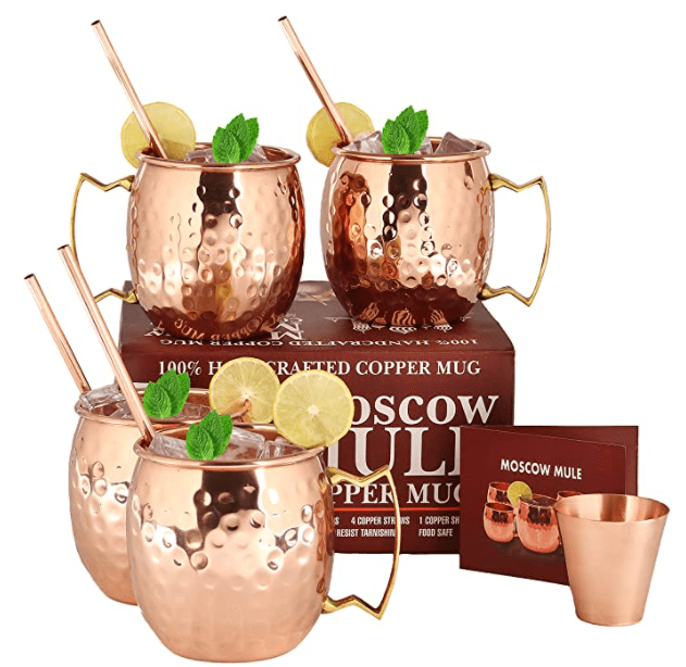 Moscow Mule is the official cocktail of 2020! This handcrafted Moscow Mule set includes 4 handcrafted food grade Copper Mule Mugs, 4 Pure Copper Straws, 1 Shot Glass and Recipe Booklet.