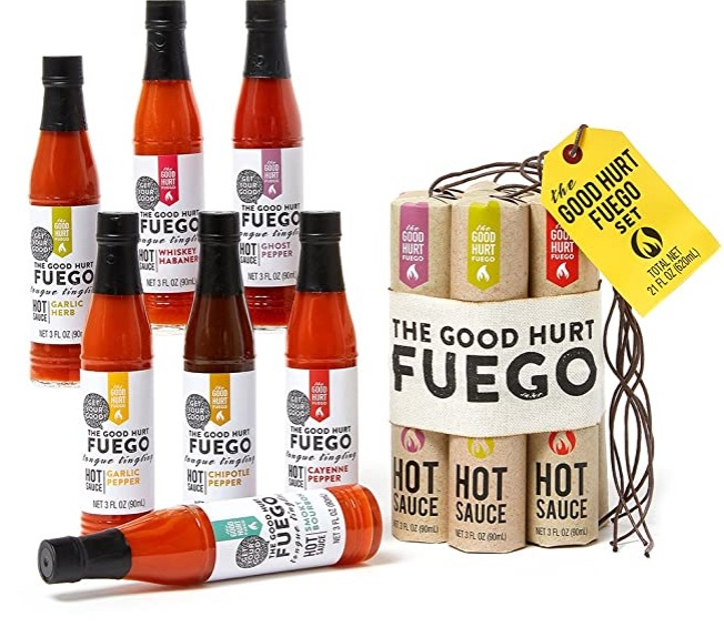 This Fuego set contains seven hot sauces from around the world packed in a fun giftable dynamite pack. Garlic Herb, Smoky Bourbon, Garlic Pepper, Chipotle Pepper, Cayenne Pepper, Whiskey Habanero, and Ghost Pepper – these hot sauces range from mild to blazing hot, so your giftee is bound to find a new favorite!
