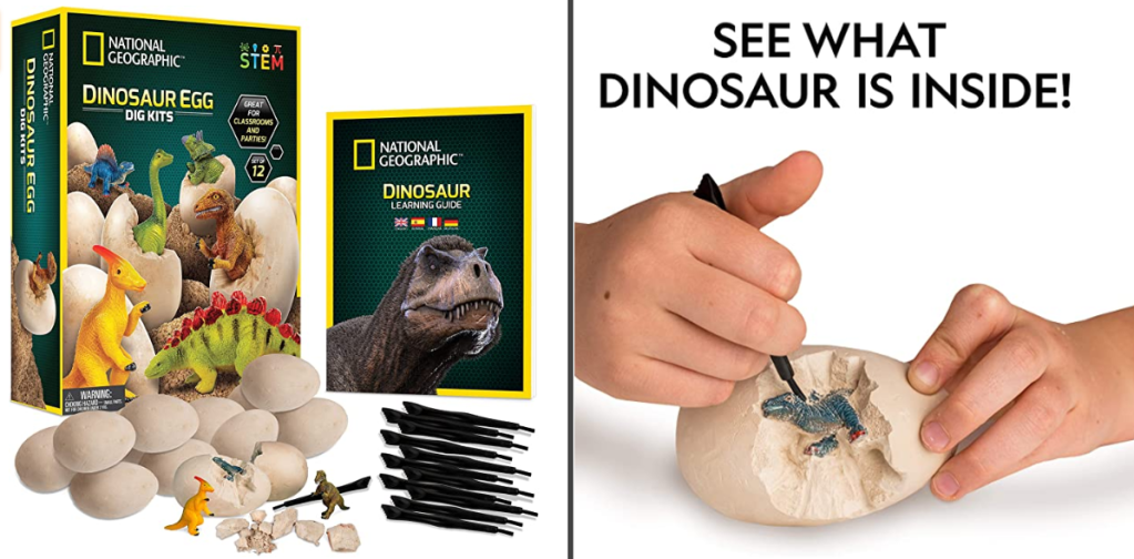 I will go to great lengths to get my kids outside and keep them away from screen. This handy set includes 12 mystery dinosaur eggs with 12 excavation tools. This can be used as a group activity, party favor or I just give one per kid few times a week when boredom strikes. It comes with a bonus dinosaur guide, so kids have fun identifying their finds or hoping to get their favorite. Pro tip: if digging gets to be too much, eggs can be soaked in water for an easy reveal.